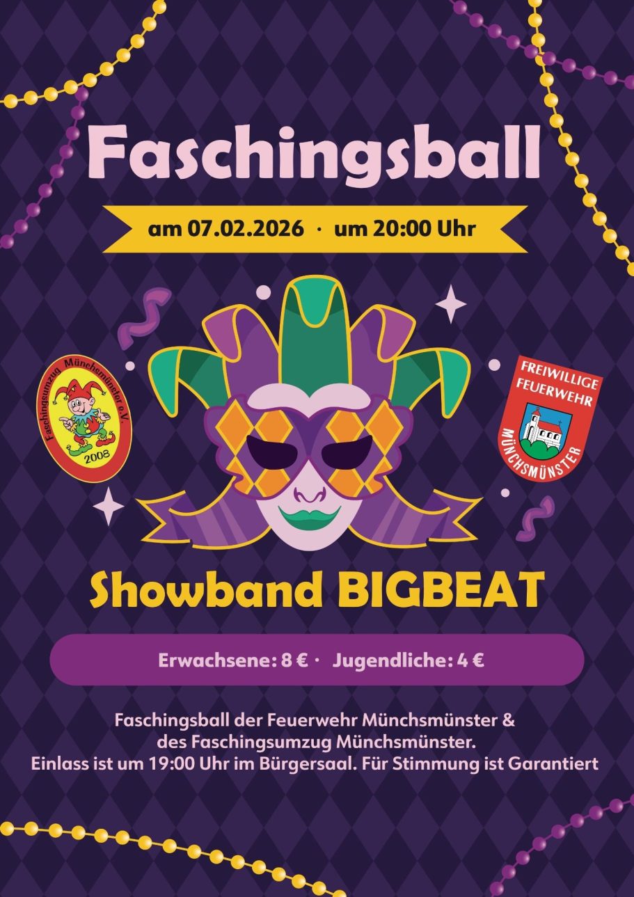 Tauchen Sie ein in die Welt des Faschings beim Faschingsball der Feuerwehr Münchsmünster & Faschingsumzug Münchsmünster e.V. am 07. Februar 2026! Unser festlicher Ball im Bürgersaal Münchsmünster bietet eine magische Atmosphäre mit der Showband -BIGBEAT-. Feiern Sie mit uns eine Nacht voller Spaß, Tanz und unvergesslicher Momente!